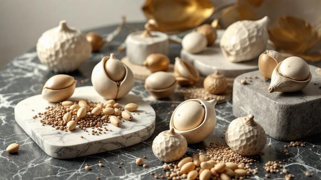 - Ceramic cocoa pods and bronze magnolia seeds convey narratives with clarity and assurance
